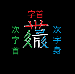 - 字身が組合字のときは先ほどと同様にして更に分割し、最初の部分を「次字首」、残りの部分を「次字身」と呼びます。